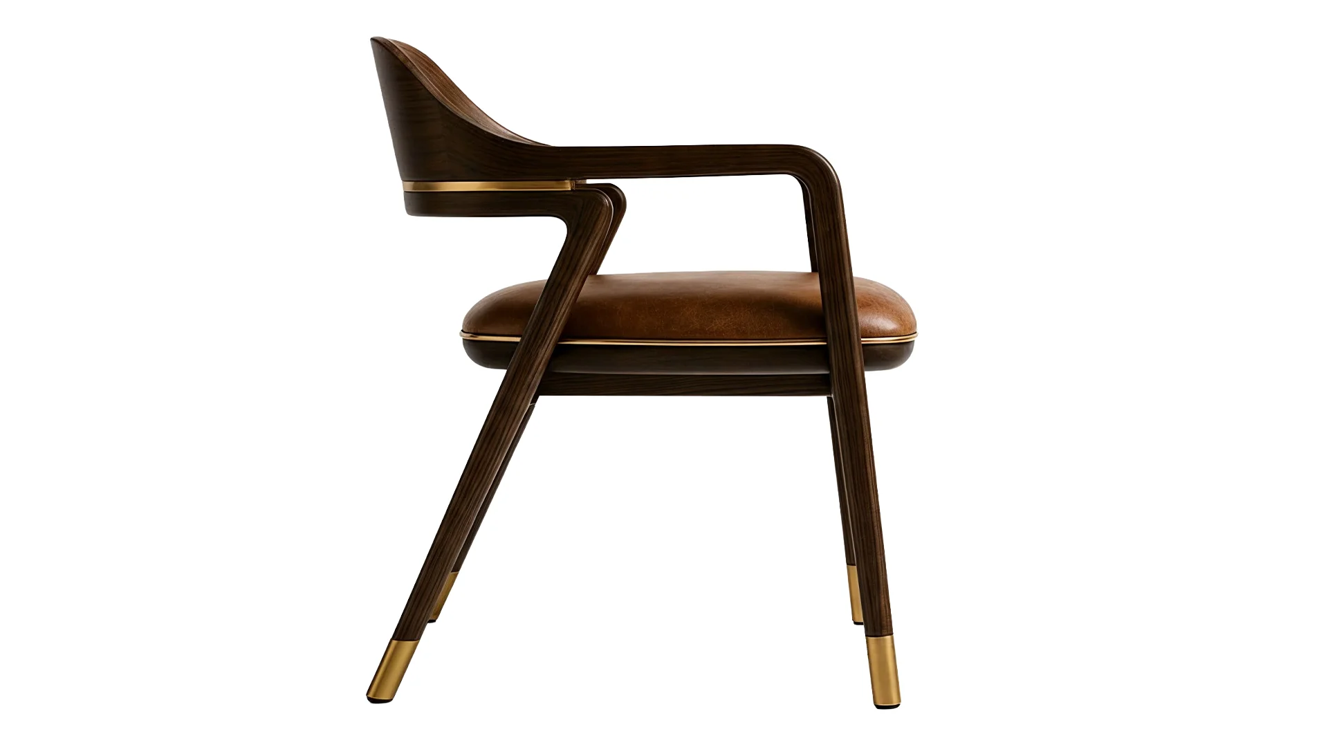 The Angela Chair is crafted from rich solid walnut, showcasing a beautifully sculpted backrest and seamless arm transitions that highlight its refined,contemporary form. Subtle brass accents at the joints and leg tips elevate the design, adding a touch of understated luxury. Its upholstered seat providessupportive comfort, making the Angela Chair a versatile piece for dining spaces, studios or refined hospitality settings.