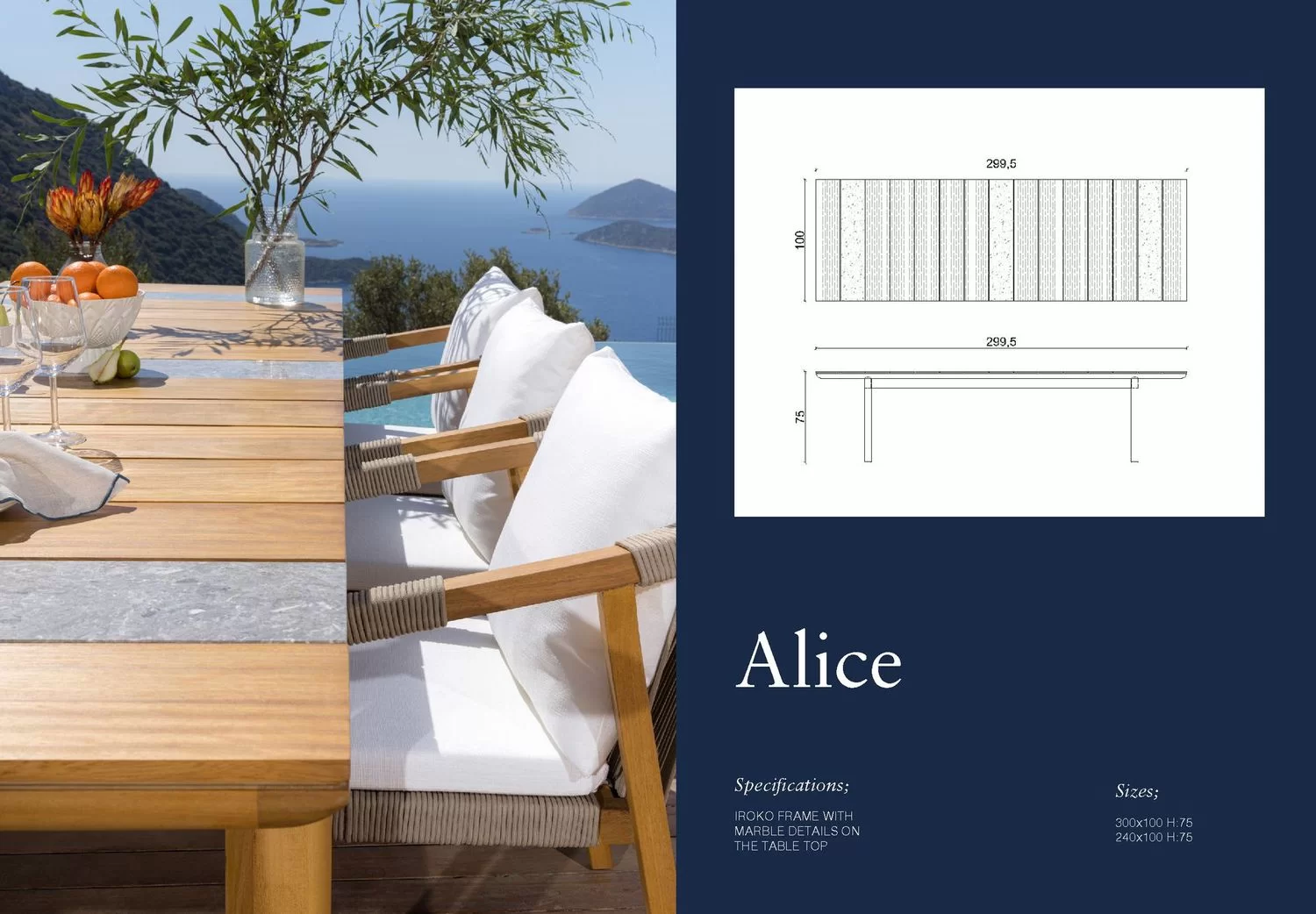 The Alice Outdoor Dining Set is a sophisticated blend of natural aesthetics and modern craftsmanship, designed for luxurious outdoor living. Featuring a spacious rectangular teak table with sleek, stone inlays, the set exudes timeless elegance. The accompanying chairs, crafted from durable teak and wrapped with all-weather rope, offer a perfect balance of comfort and style. Plush, white cushions enhance the seating experience, making it ideal for long gatherings under the sun or starlit dinners. This set seamlessly integrates with its surroundings, whether by the poolside, on a deck, or in a garden, creating an inviting atmosphere for outdoor dining and entertaining.