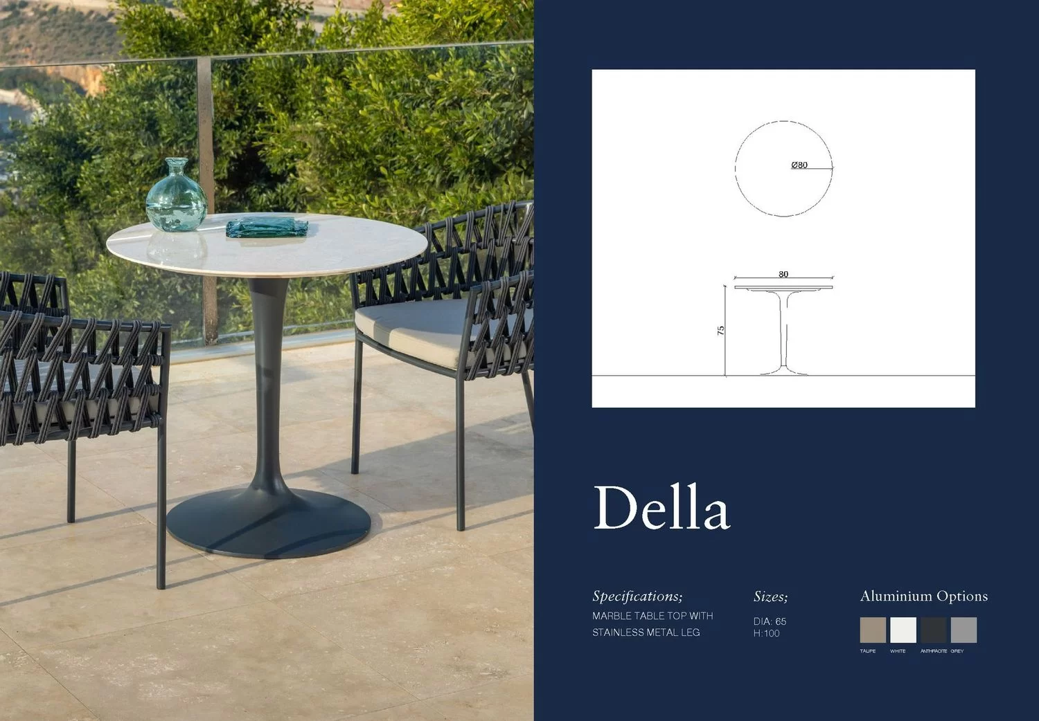 The Della Bistro Set combines contemporary elegance with functionality, making it an ideal choice for intimate outdoor spaces. The centerpiece is a sleek, round table featuring a marble-inspired top paired with a modern, tapered pedestal base for stability and style. The set includes two sophisticated chairs, designed with sturdy metal frames and intricately woven black rope that adds texture and visual interest. Comfortable cushions complete the chairs, ensuring a relaxed seating experience. Perfect for balconies, terraces, or garden nooks, the Della set provides a refined and cozy spot for enjoying drinks, meals, or scenic views.