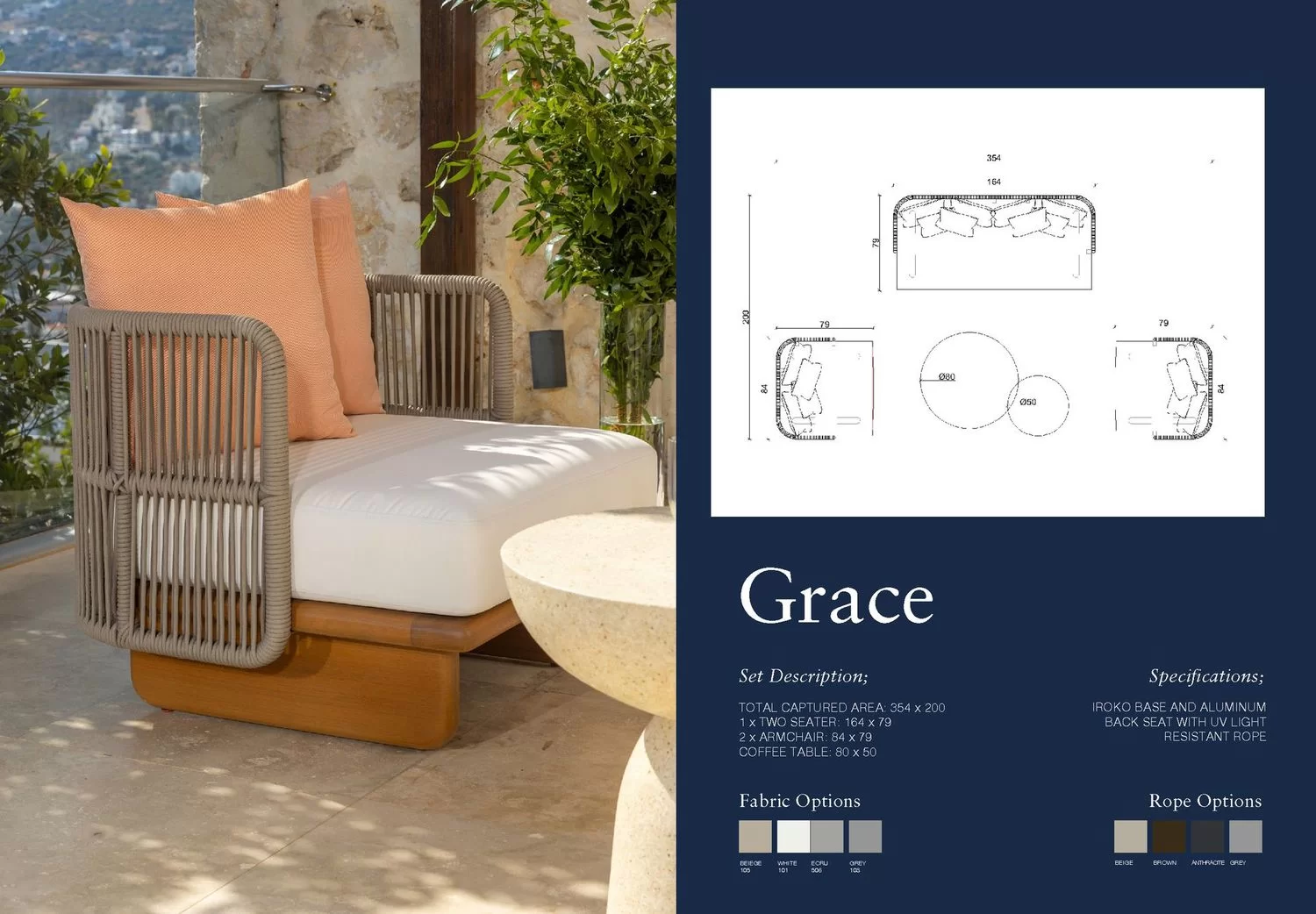 The Grace Outdoor Lounge Set is a sophisticated and modern seating arrangement crafted entirely from durable Iroko wood, known for its natural beauty and weather resistance. The set includes a three-seater sofa and two armchairs, each designed with intricately handwoven rope accents that add texture and elegance. Plush, weather-resistant cushions in neutral and soft peach tones provide luxurious comfort while complementing the natural warmth of the Iroko wood. The set is completed with two unique stone-textured coffee tables featuring sculptural bases, perfect for creating a chic and inviting outdoor space. Ideal for patios, terraces, or garden lounging, the Grace set combines timeless design with exceptional craftsmanship.