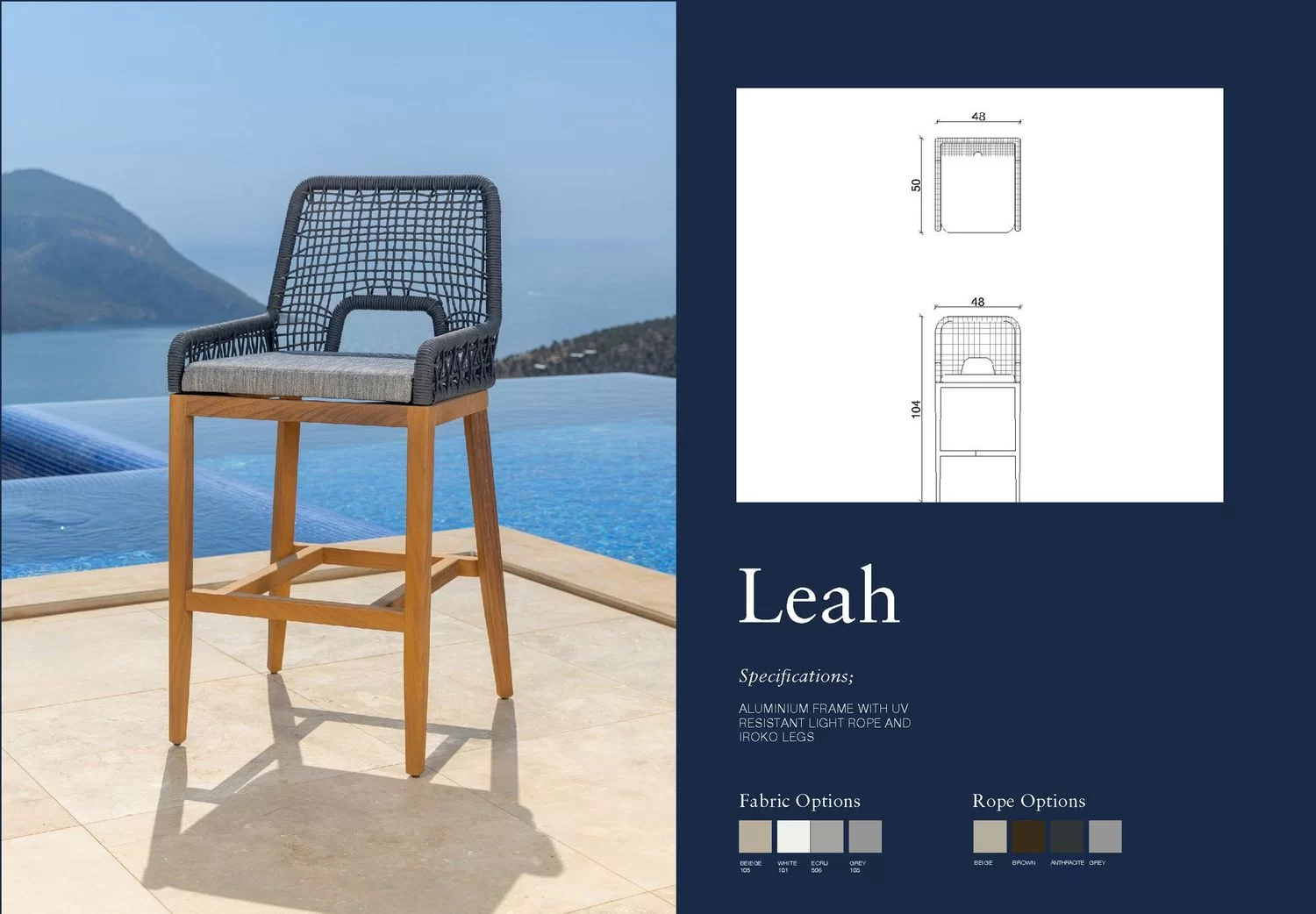 The Leah Bar Chair combines comfort and contemporary style, featuring a sturdy teak wood frame and a woven rope backrest for a modern coastal vibe. Its ergonomic design includes a cushioned seat for added comfort, making it ideal for outdoor bar settings or poolside relaxation. Designed to withstand the elements, the Leah Bar Chair is both durable and elegant, enhancing any outdoor space.