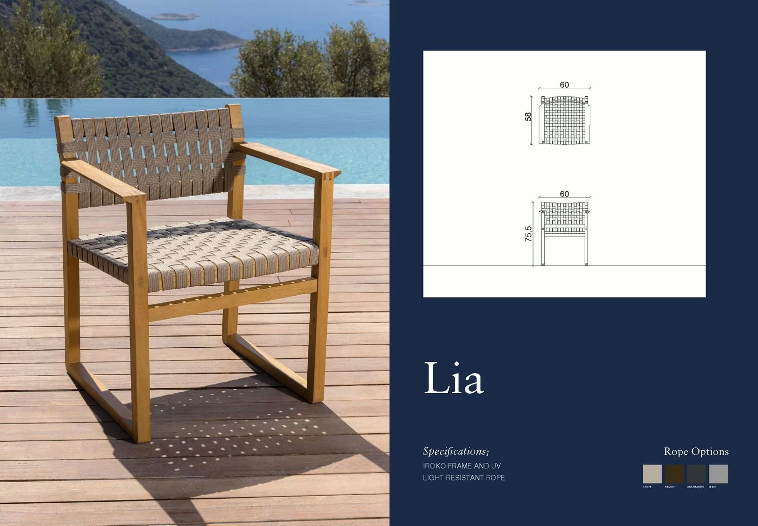 The Lia Chair combines modern aesthetics with exceptional craftsmanship, featuring a solid teak frame paired with woven rope detailing for durability and style. Its ergonomic design ensures comfort while adding an elegant touch to any outdoor or indoor dining setting. Perfect for those seeking functional sophistication.