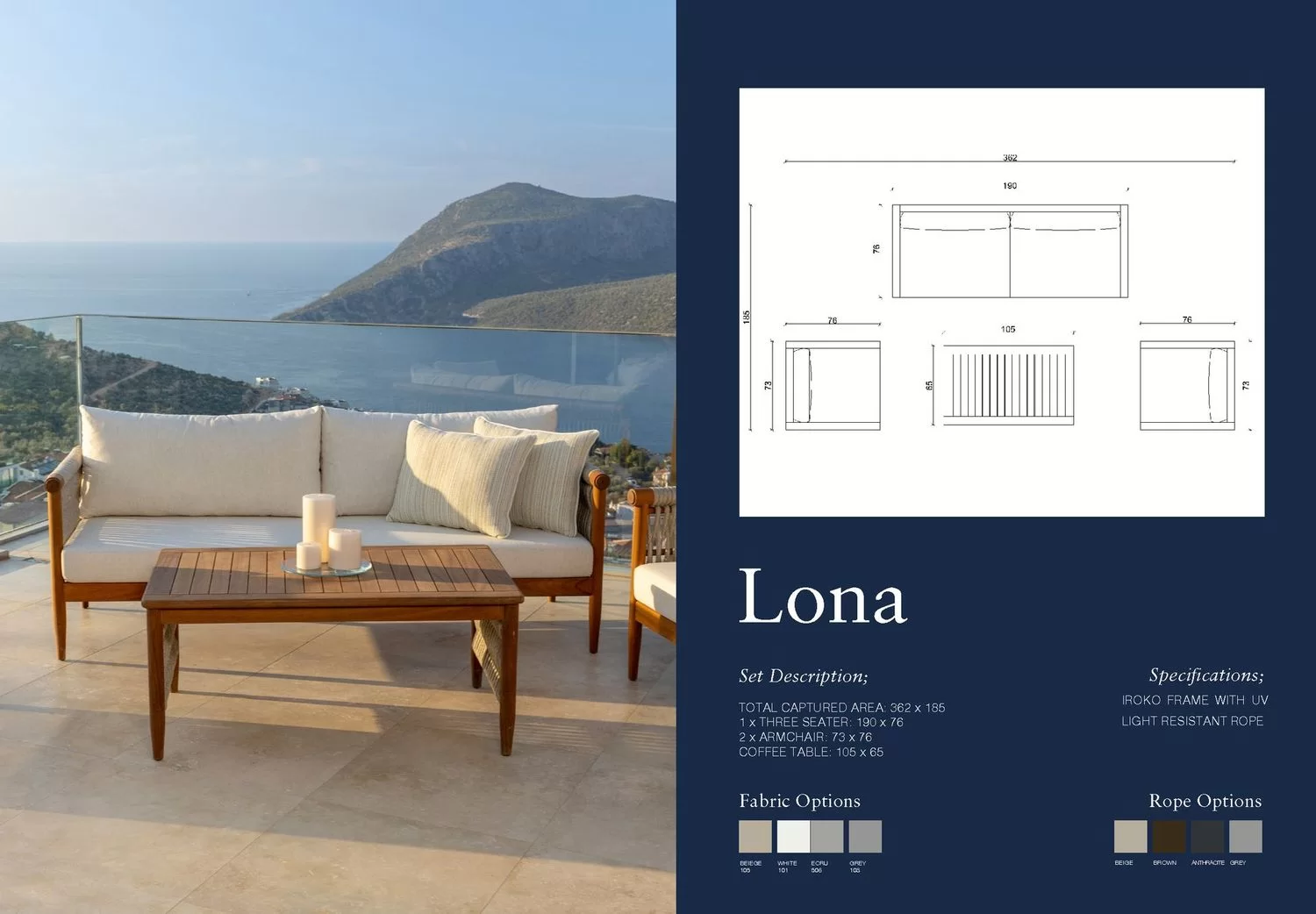 The Lona Outdoor Lounge Set is a refined and elegant collection, expertly crafted from premium Iroko wood to ensure durability and timeless beauty. The set features a three-seater sofa, two armchairs, and a coffee table, all designed with clean lines and sophisticated details. The sofa and armchairs are accented with intricately handwoven rope details, adding a contemporary touch to the natural warmth of the Iroko frames. Plush, weather-resistant cushions in neutral tones provide superior comfort, making this set perfect for relaxing or entertaining outdoors. The matching Iroko coffee table completes the ensemble, offering a functional and stylish centerpiece for patios, terraces, or garden spaces.