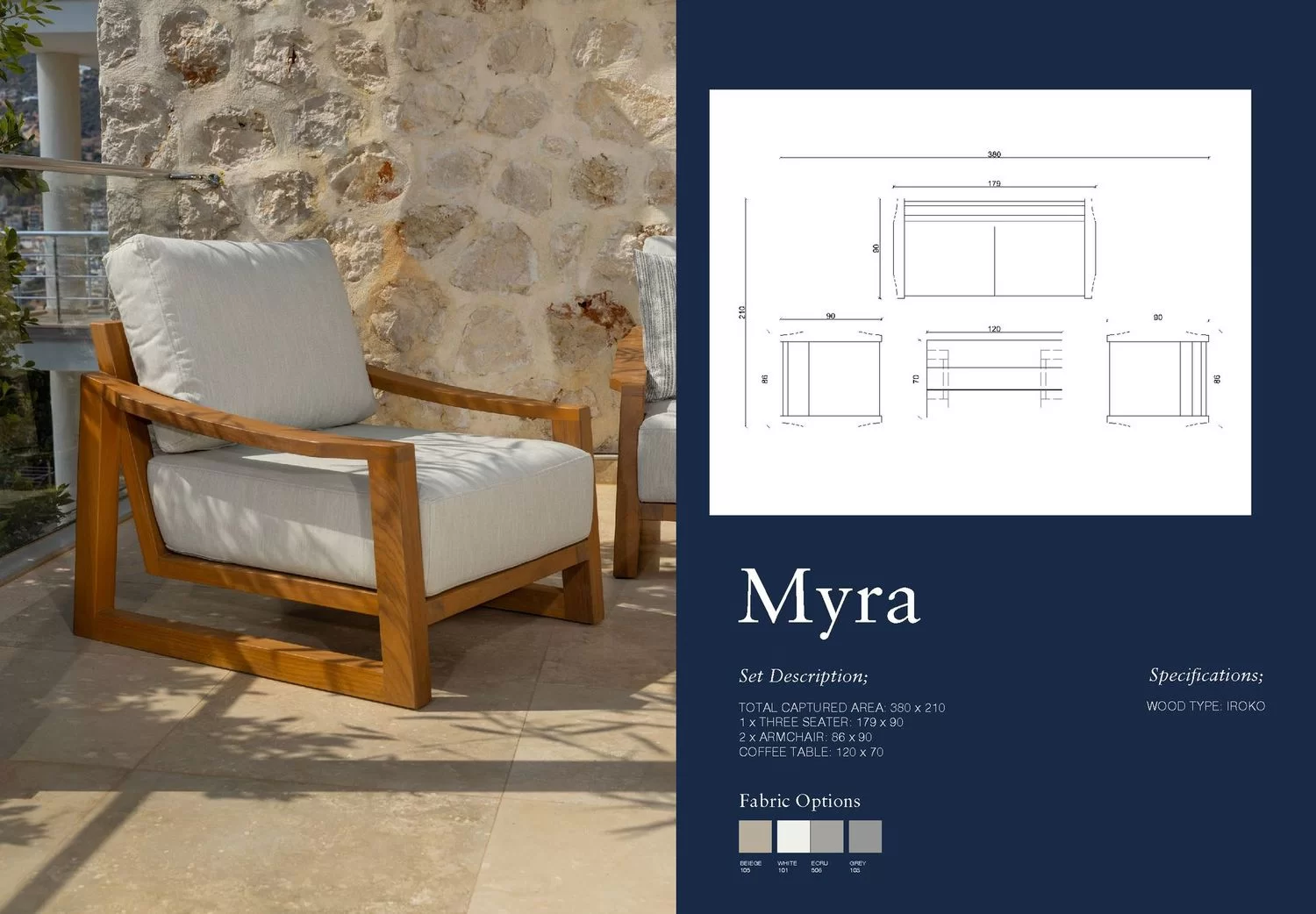 The Myra Outdoor Lounge Set is a perfect blend of modern design and natural craftsmanship, made entirely from premium Iroko wood. This durable and weather-resistant set includes a two-seater sofa, two armchairs, and a rectangular coffee table, all designed with clean, angular lines that highlight the beauty of the Iroko’s natural grain. The seating features generously padded, weather-resistant cushions in soft neutral tones, offering unmatched comfort for outdoor relaxation. The solid Iroko coffee table provides a sturdy and stylish surface for drinks or decor. Ideal for patios, terraces, or garden spaces, the Myra set creates an inviting and sophisticated outdoor living experience.
